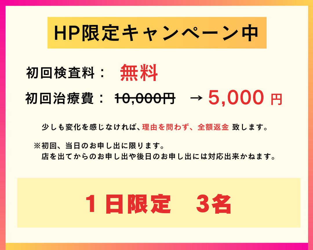初回施術につき、全額返金保証。万が一、施術効果を実感出来ない場合はお申し出ください。